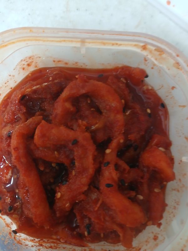 새콤달콤합니다 그냥 먹을 때는 괜찮은데 밥 반찬으로는 좀 다네요