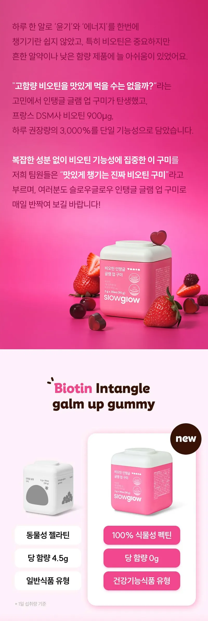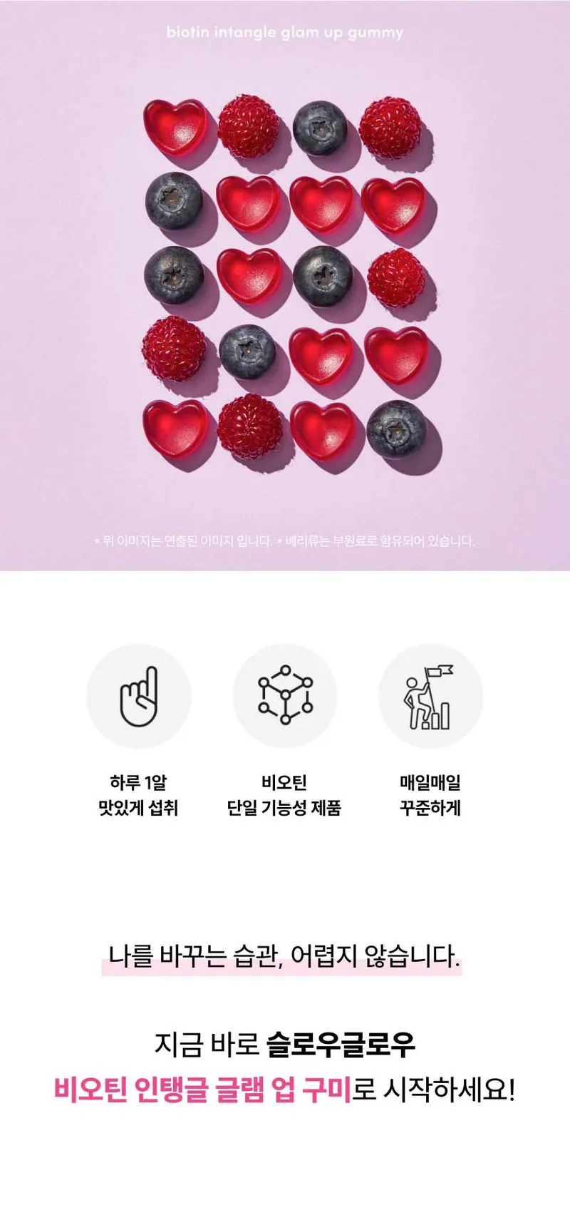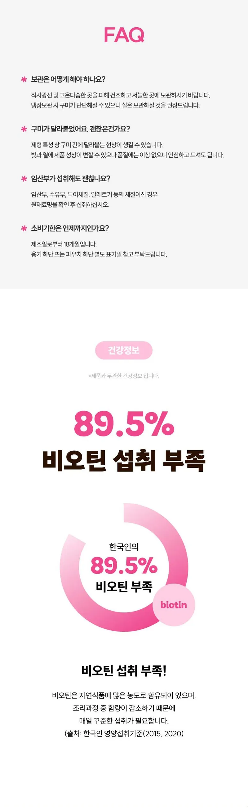 구미 1개 당 비오틴 하루 영양성분기준치 3000% 충족시킬 수 있는 함량이 들어있어요! 불필요한 첨가물을 최소화 해서 더욱 부담 없으실 거예요.