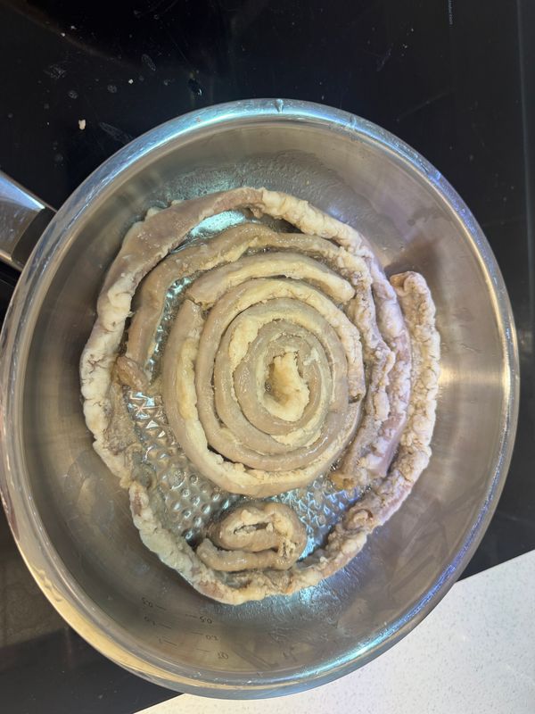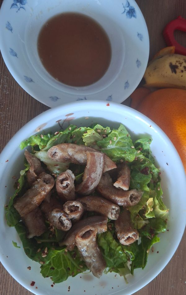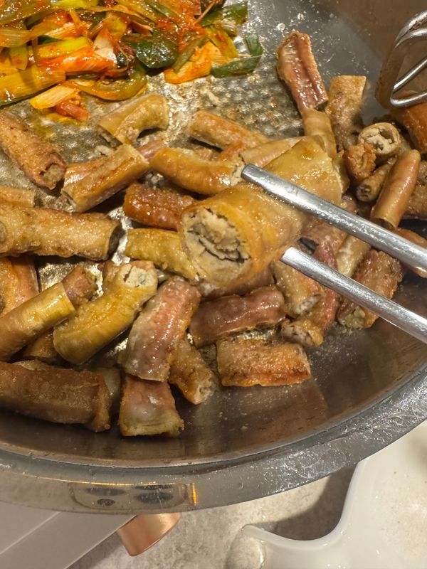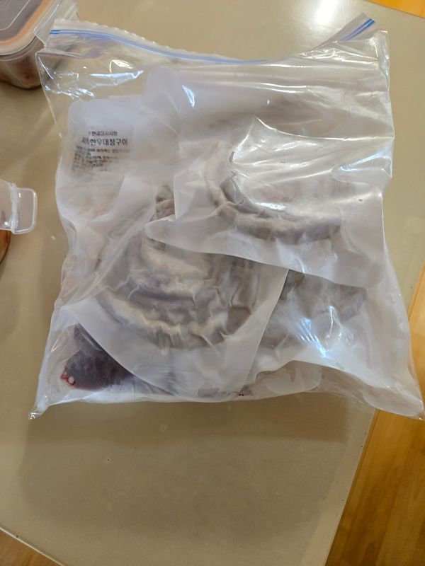 초벌이라 곱 보관 상태 그대로 굽기 쉬웠고 기름에 튀기듯이 굽다가 마지막에 기름 덜어내고 먹었어요. 질기지 않고 곱 고소했습니다. 다만 저는 너무 오래 구운 느낌이라 노릇해지면 바로 먹는 게 더 맛날 것 같아요.