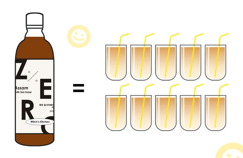 진한 차향으로 밀크티 본연의 맛이 잘 드러나는 베이스입니다. 고소하고 쌉싸름한 맛으로 밀크티를 처음 드시는 분들께 추천드려요. 4:1 비율로 우유 또는 두유 200ml에 원액 50ml를 넣고 잘 저어주기만 하면 완성! 제로 밀크티베이스 1병으로 총 10잔의 제로 밀크티를 만들어 드실 수 있어요.