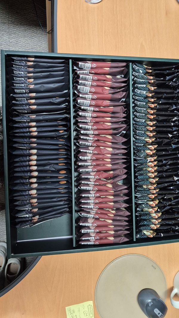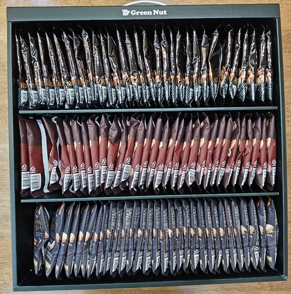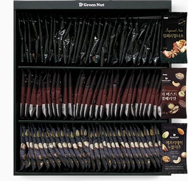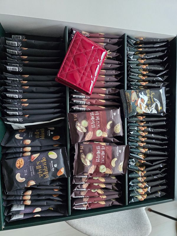 이전에 구매해서 먹어보니 내용물의 양도 넉넉하고 견과의 종류도 고급스러워서 이번엔 선물용으로 구매했어요. 스탭이 많이 오가는 스테이션에 선물로 넣기 적합한 90개의 큰 구성이어서 아주 좋았습니다. 재재구매 의사 있습니다. ㅎㅎ