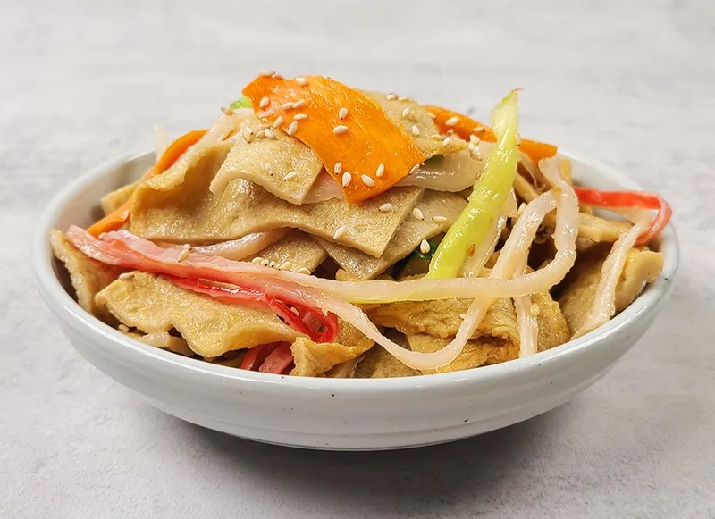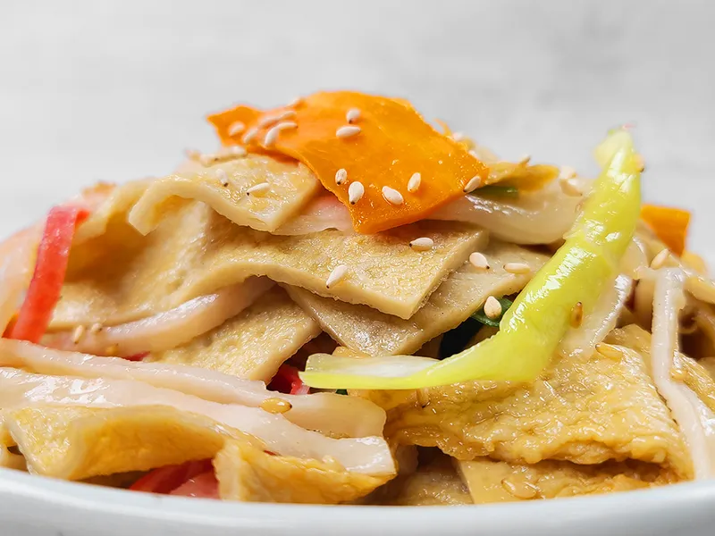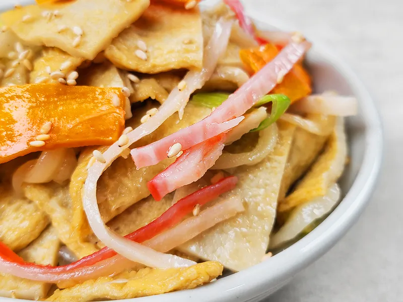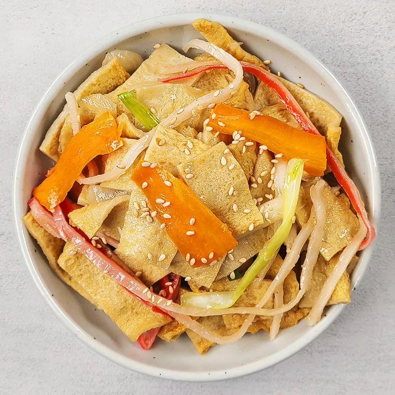 부드러운 식감의 감칠맛 좋은 어묵과 고소한 맛살의 만남! 특제 간장소스로 볶아 짜지 않지 않아요. 자극적이지 않은 맛으로 아이들 반찬으로도 좋습니다.