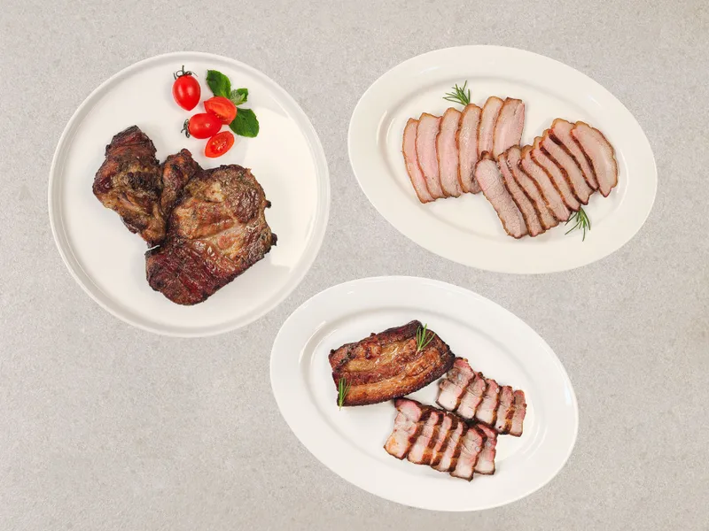 볏짚을 태운 강한 화력으로 순간 초벌한 고기 3종이에요. 삼겹살은 두툼하게 익어 바비큐처럼 불향이 살아 있고,