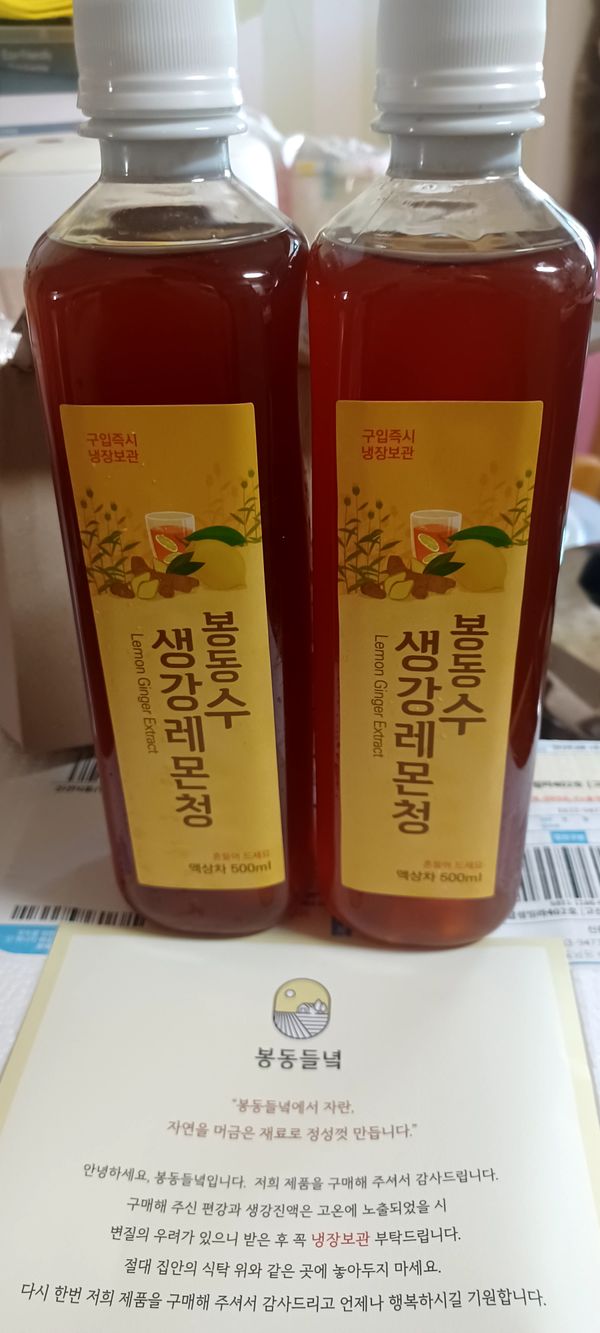 날씨가 추워져서 비상용으로 후기 보구 주문을 했는데 생각보다 맛 괜찮네요~^달콤 하면서도 아카시아 벌꿀 향이 나면서 목 안이 시원 하네요~^감기가 금방 나을거 같은 기분이요~^오자 마자 신랑 한잔 타 줬더니 약은 안먹을라더니 봉동 수 생강 레몬청은 맛나게 마시고는 꿀잠 자네요~^
