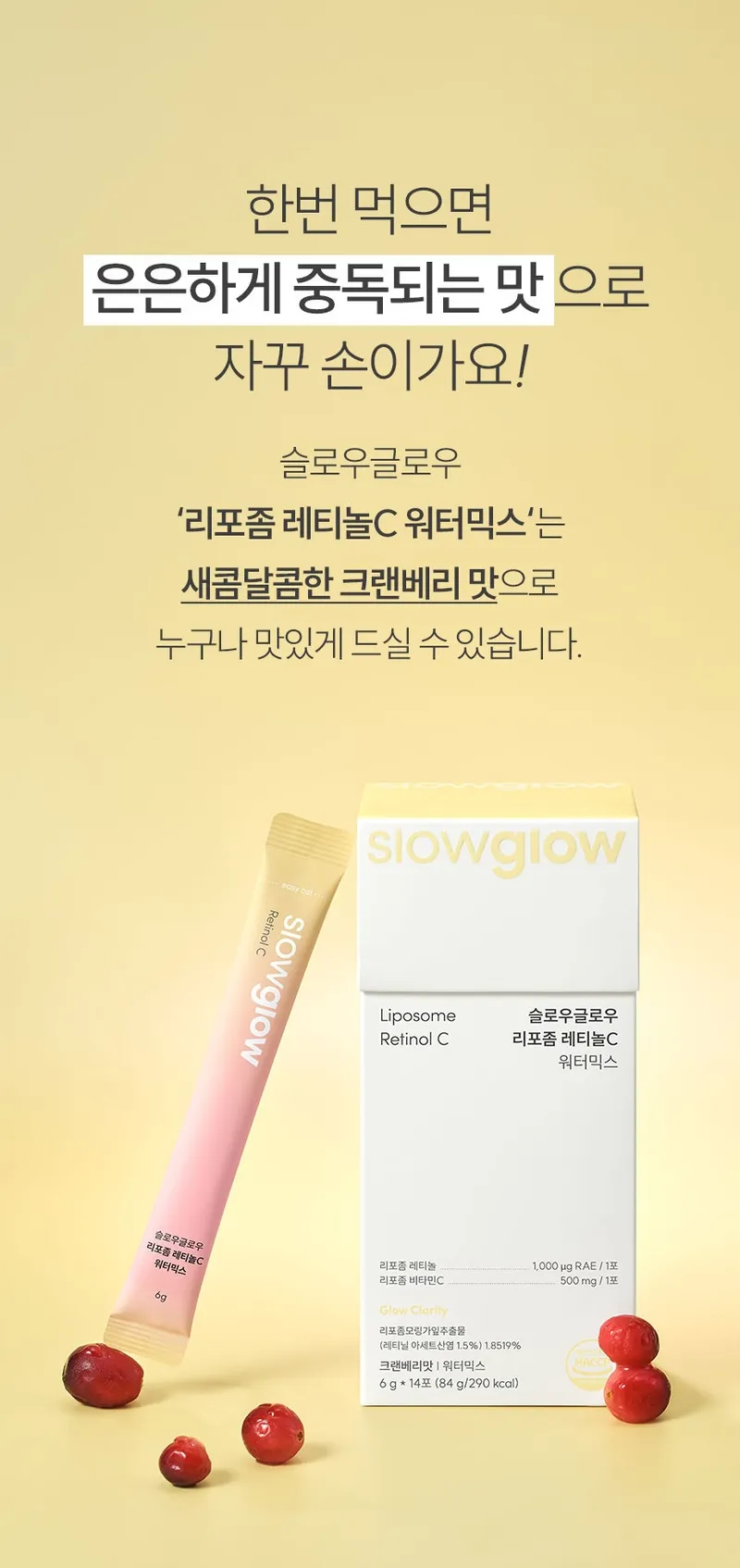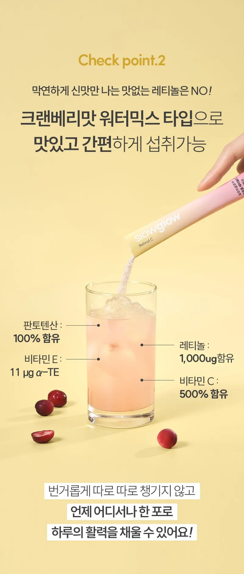 판토텐산, 레티놀, 비타민 E, 비타민 C를 크랜베리 맛으로 맛있게 즐겨보세요. 1일 1음료로 간편하게 관리할 수 있답니다.