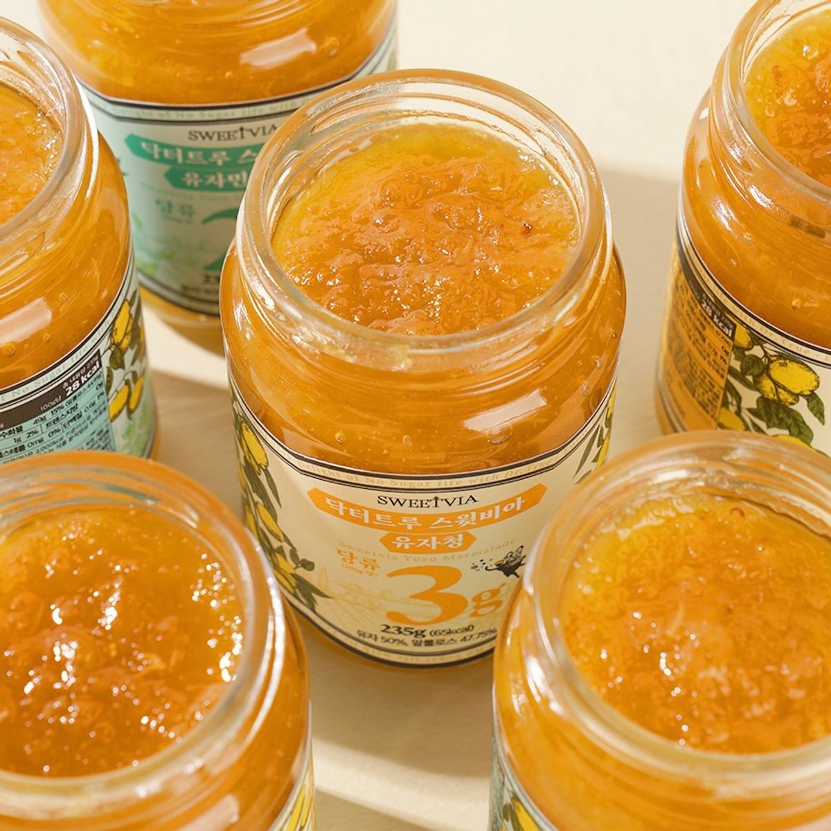 설탕 대신 건강하게 달콤한 맛을 내는 알룰로스를 사용해 일반 유자청 대비 당류는 19배, 칼로리는 9배 대폭 낮췄어요. 당 3g(유자), 2g(유자민트) 또한 설탕의 당이 아닌 유자 자체의 당이랍니다! 또한 전문 연구진이 직접 개발하여 만들었기에 더욱 믿고 드실 수 있어요 :)