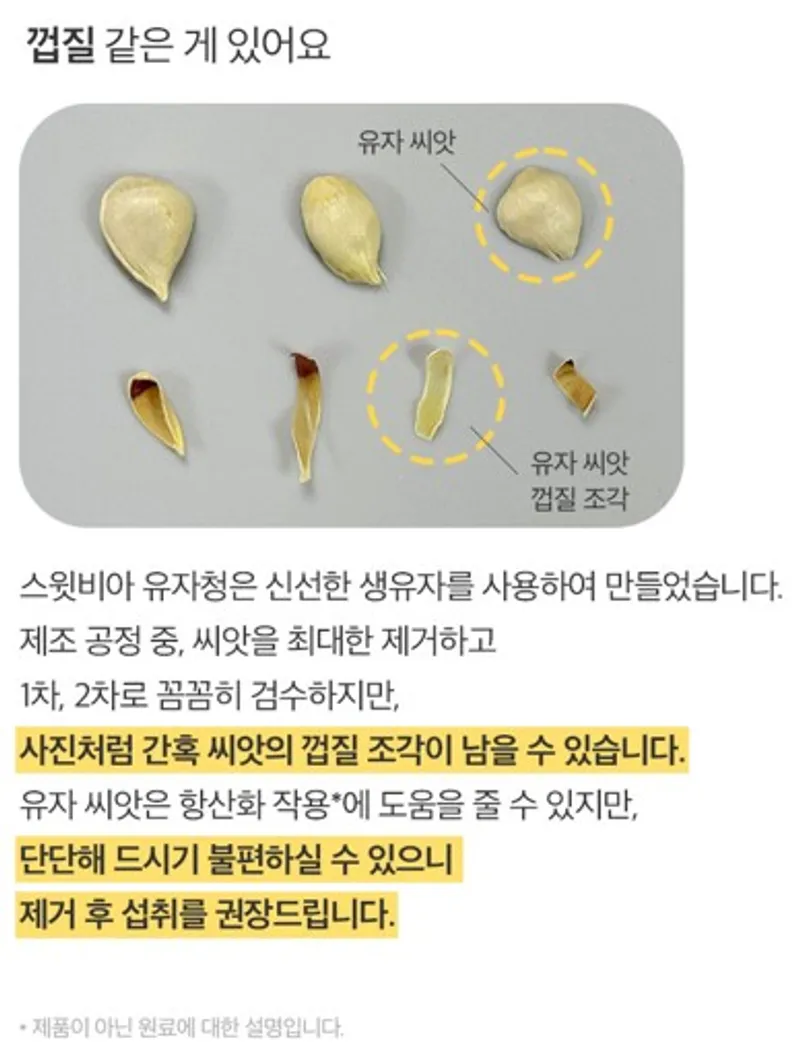 유자 껍질만 들어간 일반 유자청과 달리, 쓴맛이 나는 씨만 쏙 빼고 유자를 통째로 넣었답니다! 고흥 유자의 풍부한 맛과 영양을 그대로 살렸어요. 유자는 레몬과 사과보다 비타민C와 칼슘이 풍부하답니다!