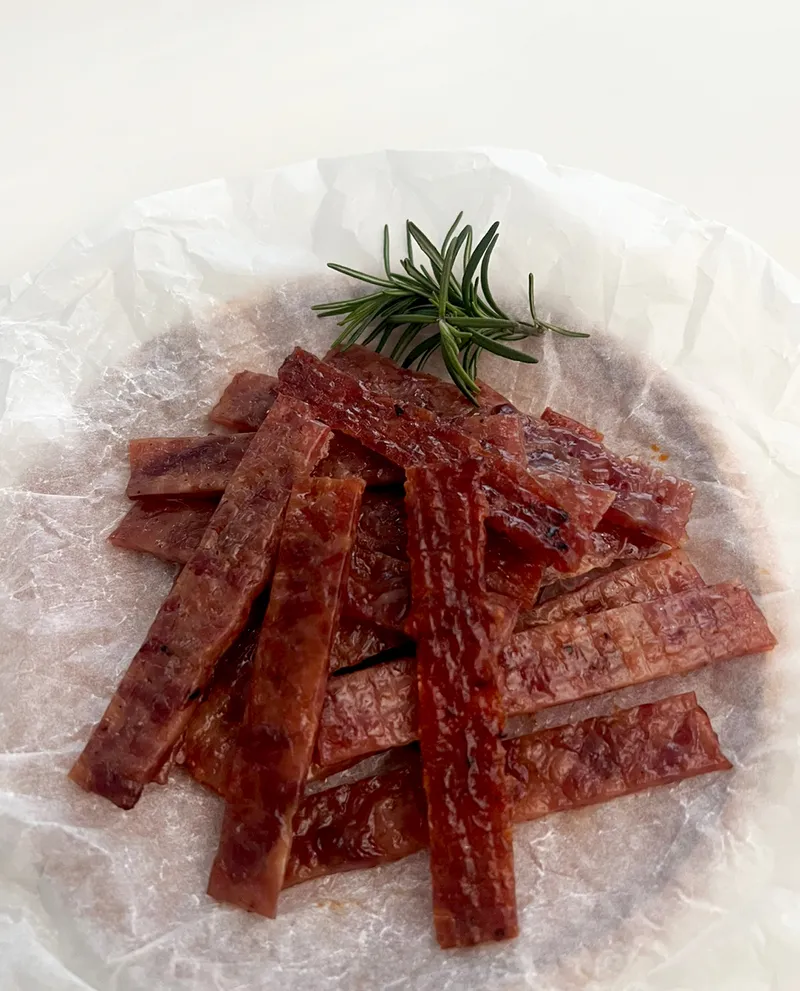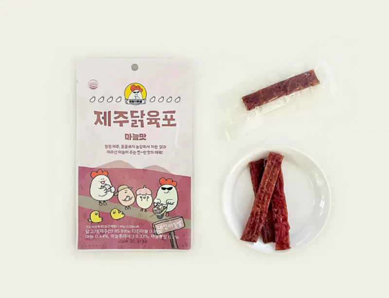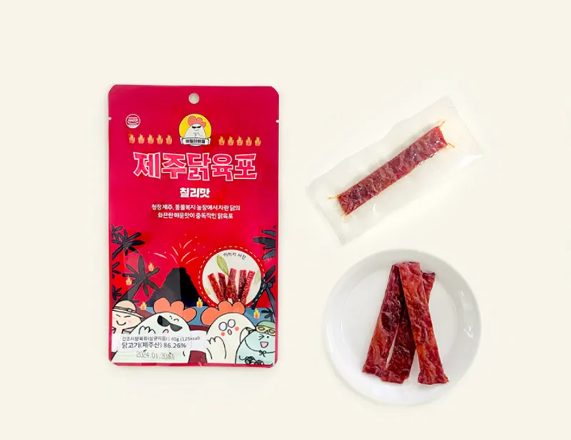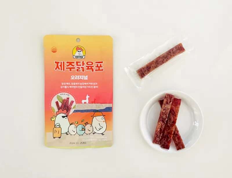 하나씩 개별포장되어 있어서 입이 심심할 때마다 간식으로 딱 좋은 닭육포입니다. 곱게 간 닭고기를 건조시켜 만드는 싱가포르식으로 만들었습니다. 감칠맛 가득 어간장을 넣은 양념을 숯불에 천천히 구워 육향과 불향을 그대로 느끼실 수 있습니다.