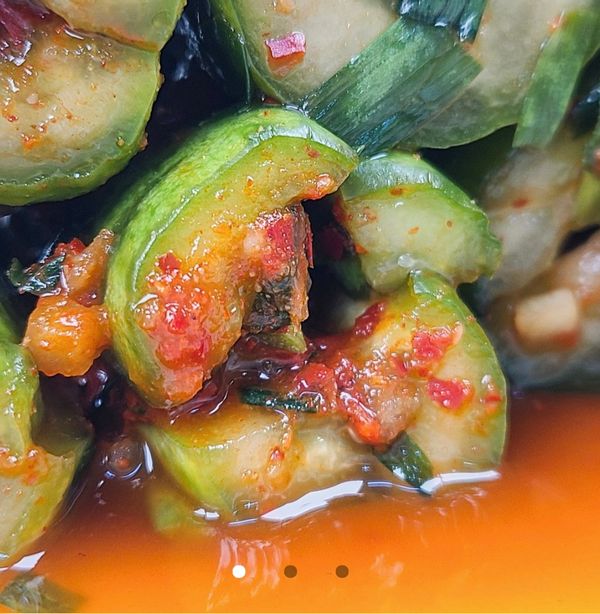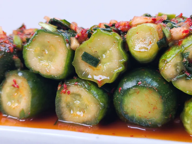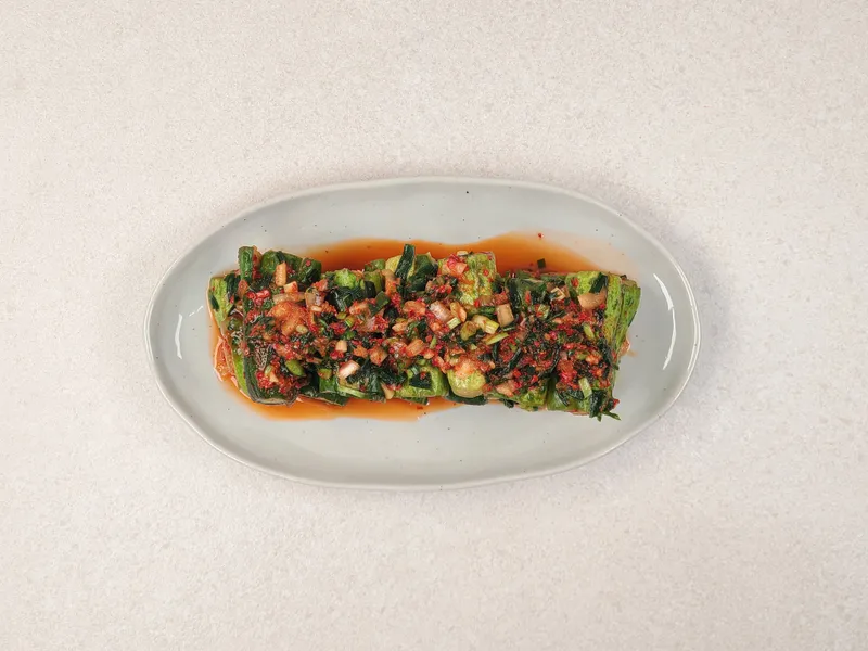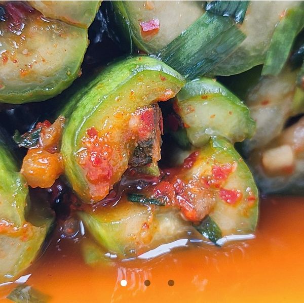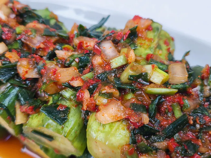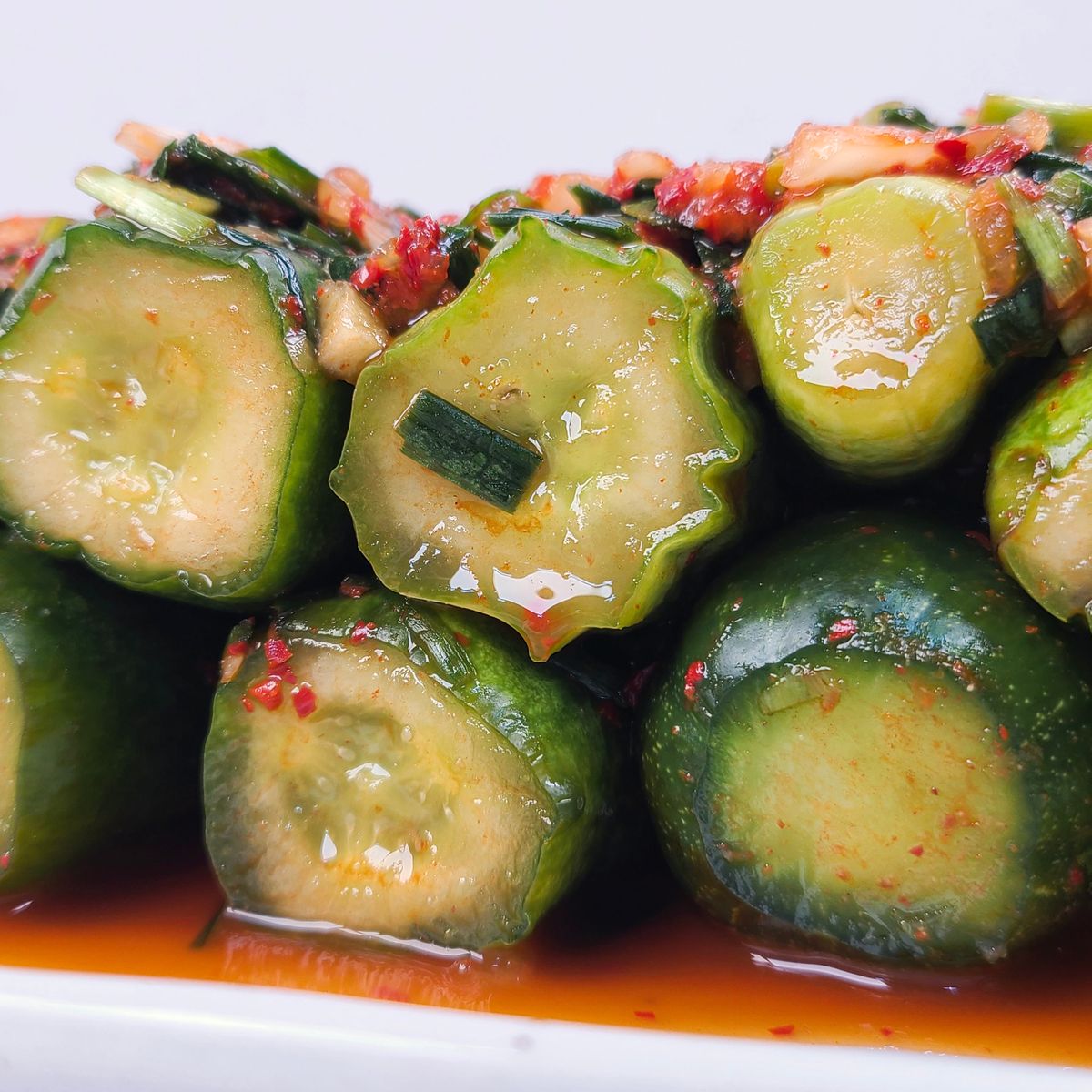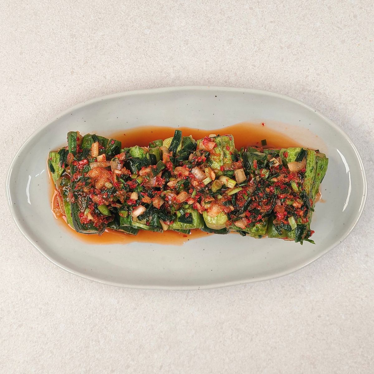 수분을 가득 머금은 오이에 속재료를 가득 넣고 올린 오이소박이입니다. 아삭아삭한 식감과 시원한 맛과 향을 제대로 느껴볼 수 있죠. 심심했던 입안에 씹는 재미를 더해주며, 개운하게 정리해 줍니다.