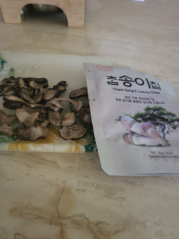 참송이 버섯 구매할 때 서비스로 주신 참송이칩 맛있어서 구매했어요. 바삭하고 다른맛 없이 오롯이 버섯 맛이라 건강식품인듯해요. 참송이칩에 서비스로 주신 참송이 자연다시 너무 좋아요. 처음에 칩인줄 알고 먹었는데 버섯향이 나면서 쫄깃하고 감칠맛 나는것이 좋네요. 참송이 다시도 구매하고 싶어요.