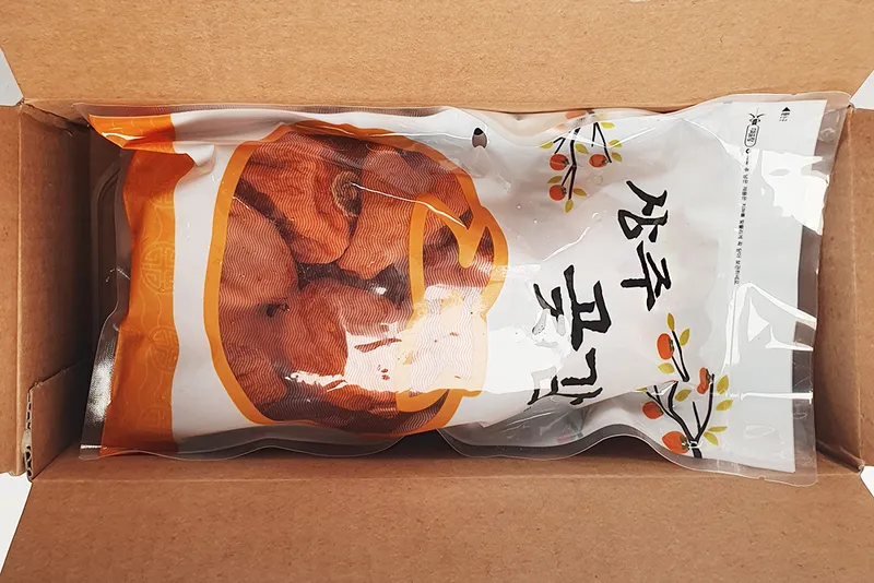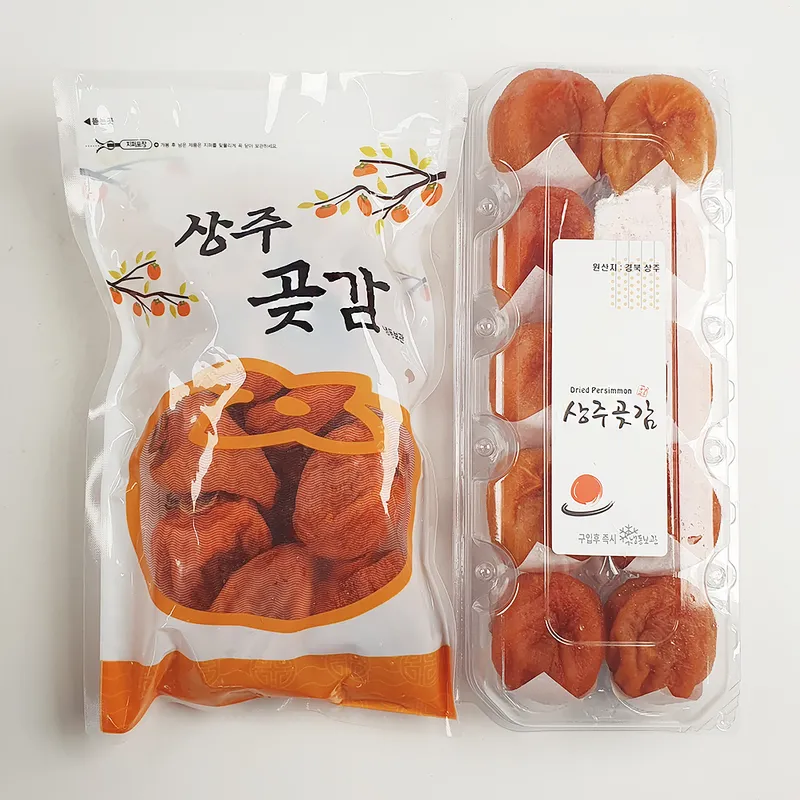 봉지에 담겨있는 곶감이 건시, 팩에 담겨있는 곶감이 반건시 입니다.