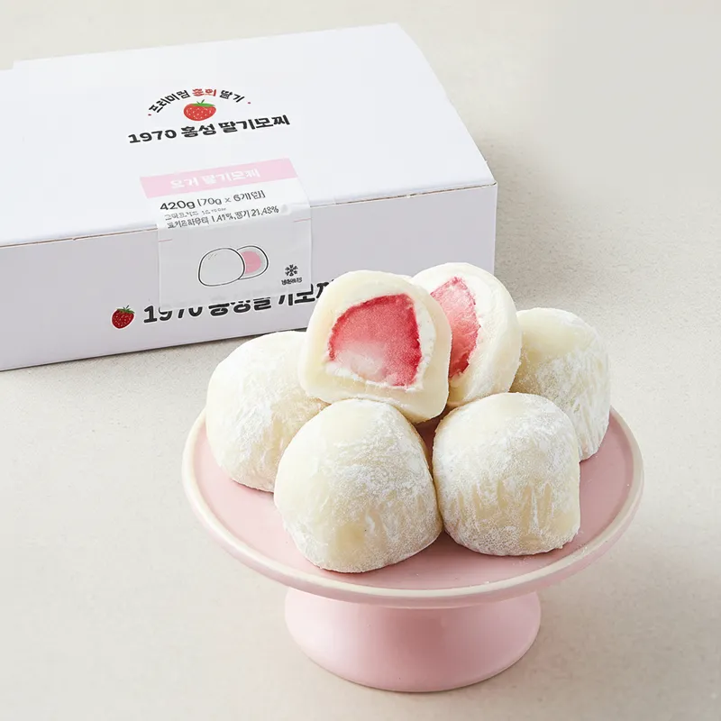 쫄깃하고 부드러운 모찌 피 속에 담긴 요거트의 깔끔한 풍미가 매력적인 간식이에요. 신선한 딸기 필링이 달콤함과 산뜻함을 더해줍니다. 한 입 베어물면 부드럽고 상큼한 맛이 입안에서 조화롭게 어우러져요.