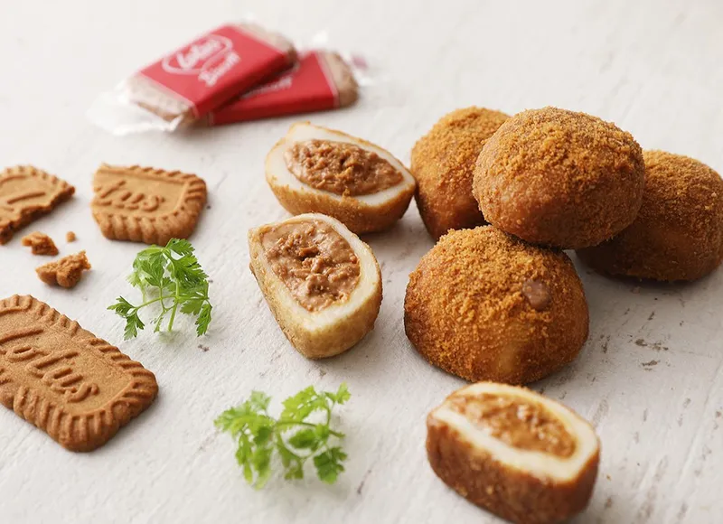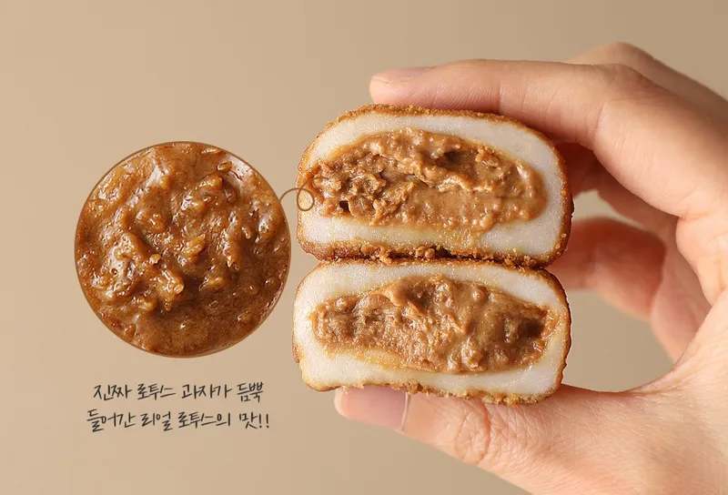로투스쿠키는 커피와 함께 먹는 과자로 유명하죠. 국내산 찹쌀로 만든 쫀득한 찹쌀떡 속에 로투스 쿠키를 듬뿍 넣었어요. 한입 베어 물면 달콤한 맛과 함께 은은하게 올라오는 카라멜향을 느끼실 수 있답니다. 로투스 쿠키 특유의 독특한 맛과 바삭함을 떡 속에 그대로 구현했어요.