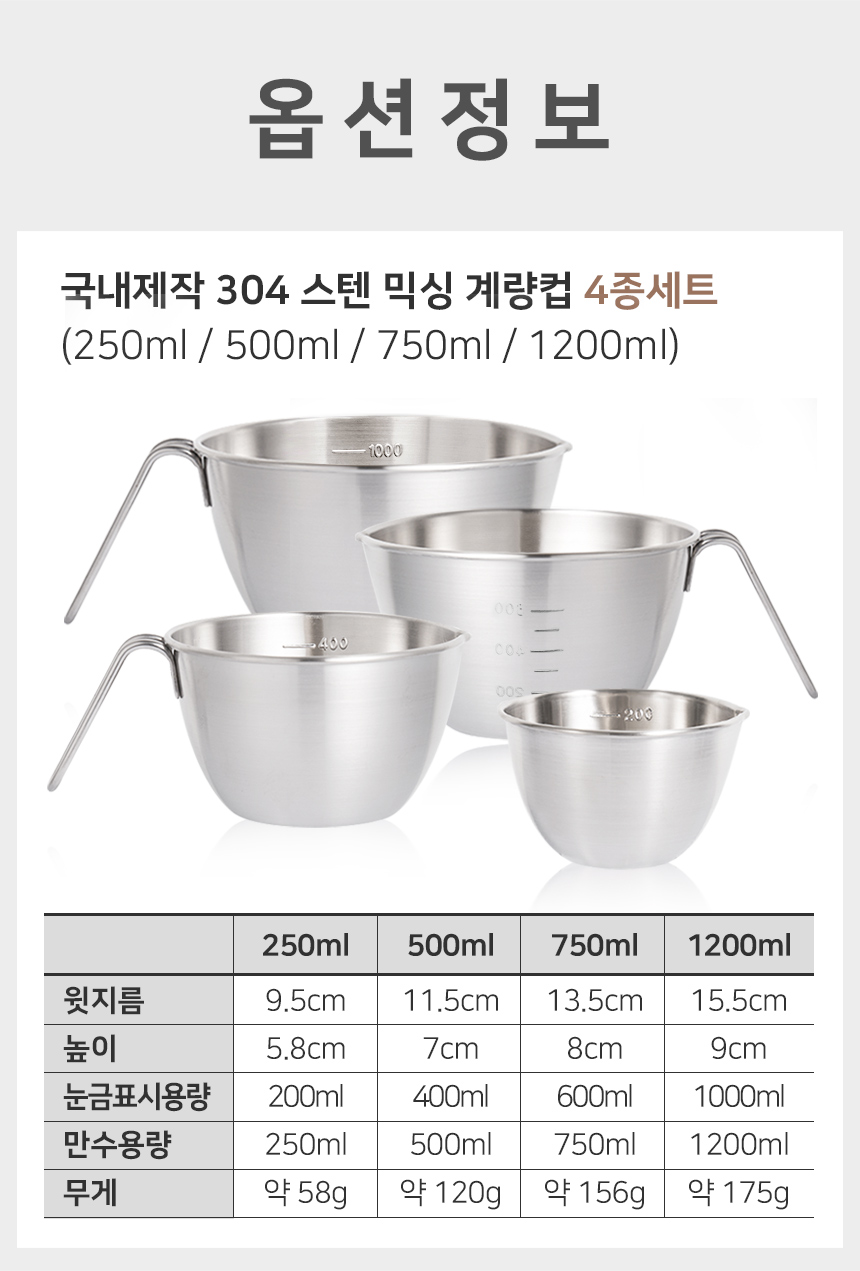 국내 제작 304 스텐 믹싱 계량컵 4종세트 (250ml/500ml/750ml/1200ml)
