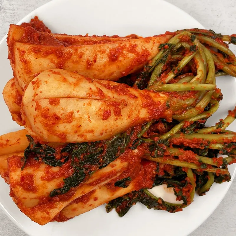 속이 꽉 찬 질 좋은 총각무만을 엄선해서 만든 총각김치입니다. 전라도식 양념에서 자연스럽게 우러나는 감칠맛은 일정 기간 자연 발효과정을 거쳐 새콤한 맛과 시원한 맛이 곁들여져 산뜻한 김치의 맛이 완성합니다.