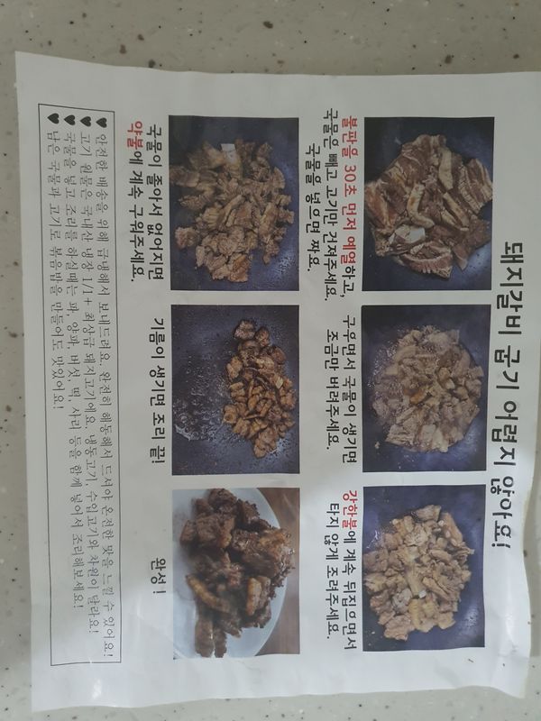 1. 달궈진 프라이팬에 돼지 갈비만 덜어주세요.