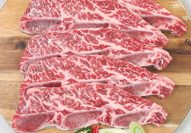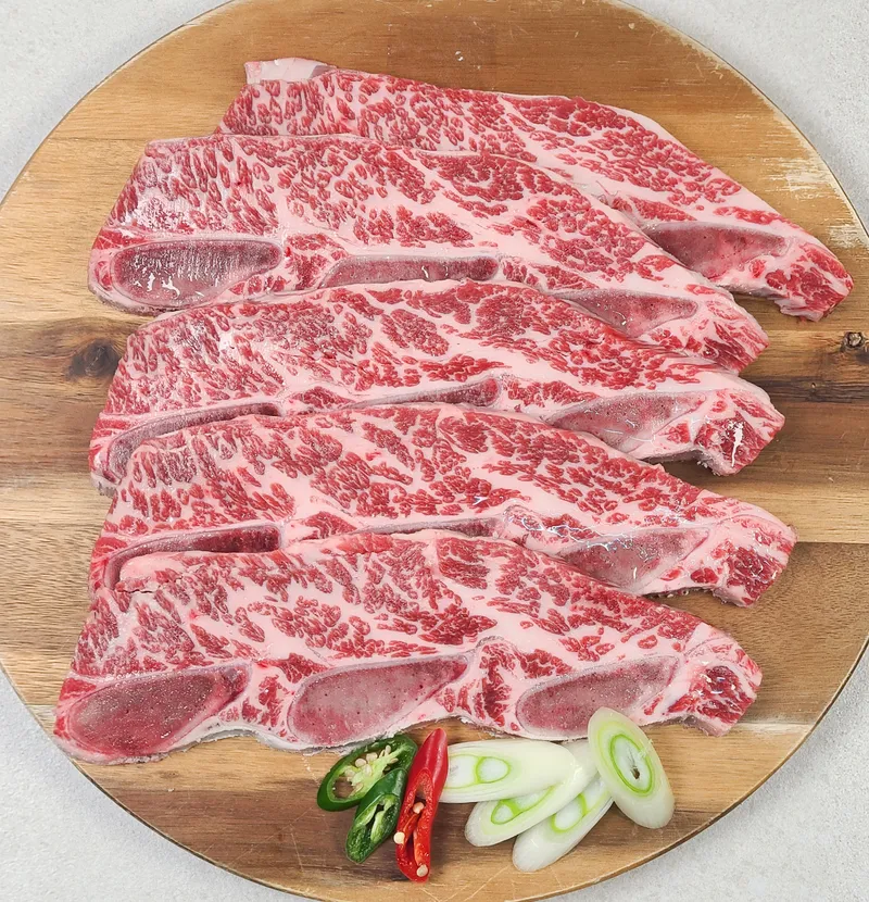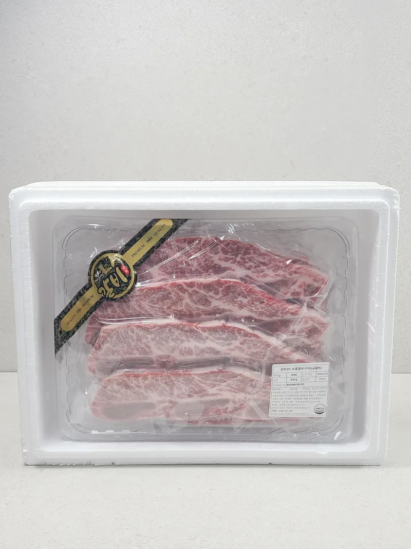 초이스 등급보다 높은 최상급 미국산 LA갈비예요. 지방 함량과 마블링 비중이 높아 부드럽고 촉촉한 식감을 자랑합니다. 버터 같은 고소함과 균일한 근내지방으로 미국 유명 스테이크 전문점의 풍미를 느낄 수 있죠.