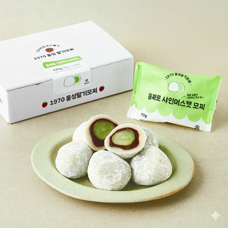 국산 찹쌀로 만든 쫄깃한 모찌 속에 상큼한 샤인머스켓을 듬뿍 담았어요. 달콤한 과일 맛과 쫀득한 찹쌀떡의 조화가 일품이에요. 한 입 베어 물면 부드러운 식감이 입안 가득 퍼져요.