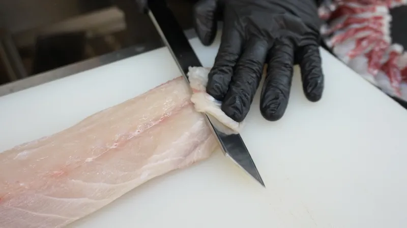 [직각 썰기] 직각 썰기를 하게 되면 민어의 쫀득한 맛을 제대로 느낄 수 있습니다.