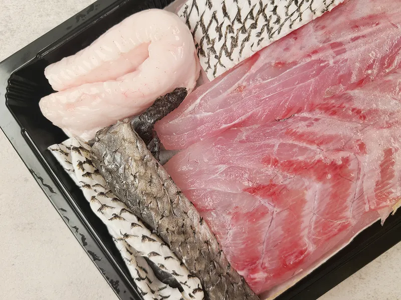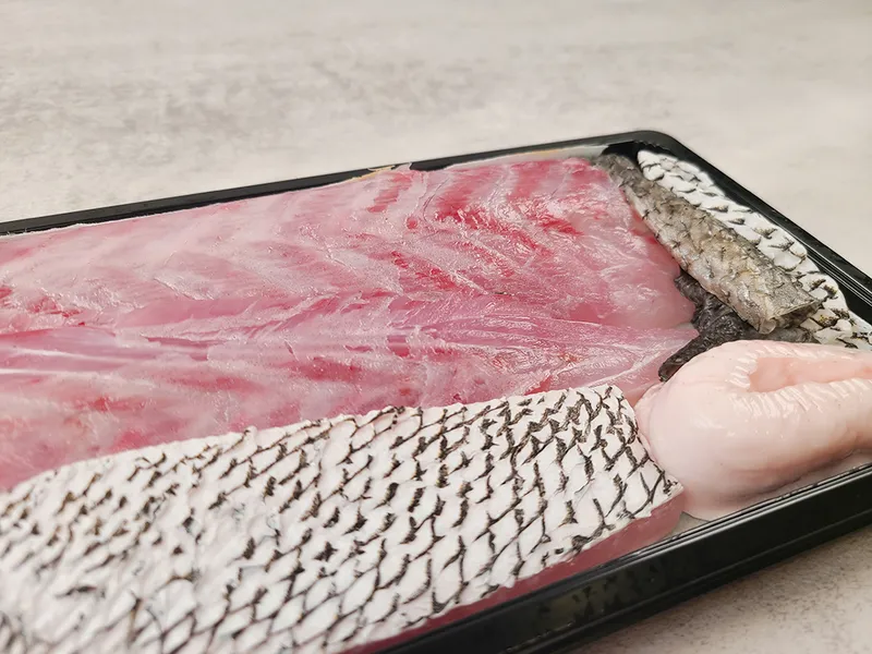 1. 포장을 벗긴 후 포장에 함께 동봉된 해동지나 키친타월로 부위별로 정리된 민어 필렛을 수분기를 닦은 후 물기가 없는 도마에 올려주세요.