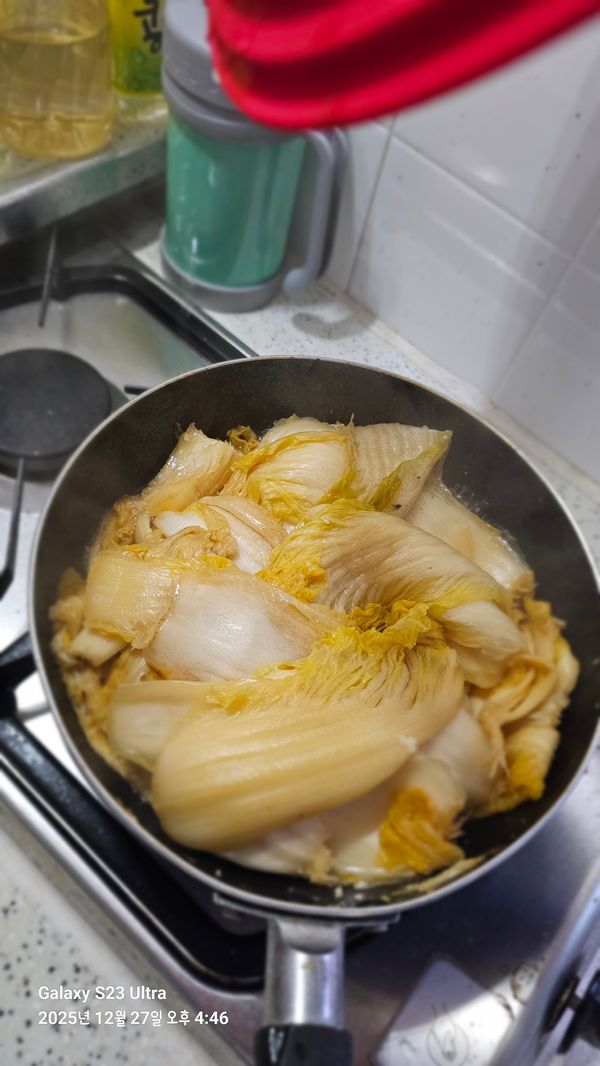 씻어서 꾹꾹 짜서 보내준거라 반포기 4쪽이 왔어요. 성분표 보니 고춧가루도 국산이고^^ 군내 안나고, 들기름이랑 멸치육수 넣고 한시간 자박자박 끓였어요~ 마늘하고 생강청 추가! 구매하길 참 잘 했어요😁