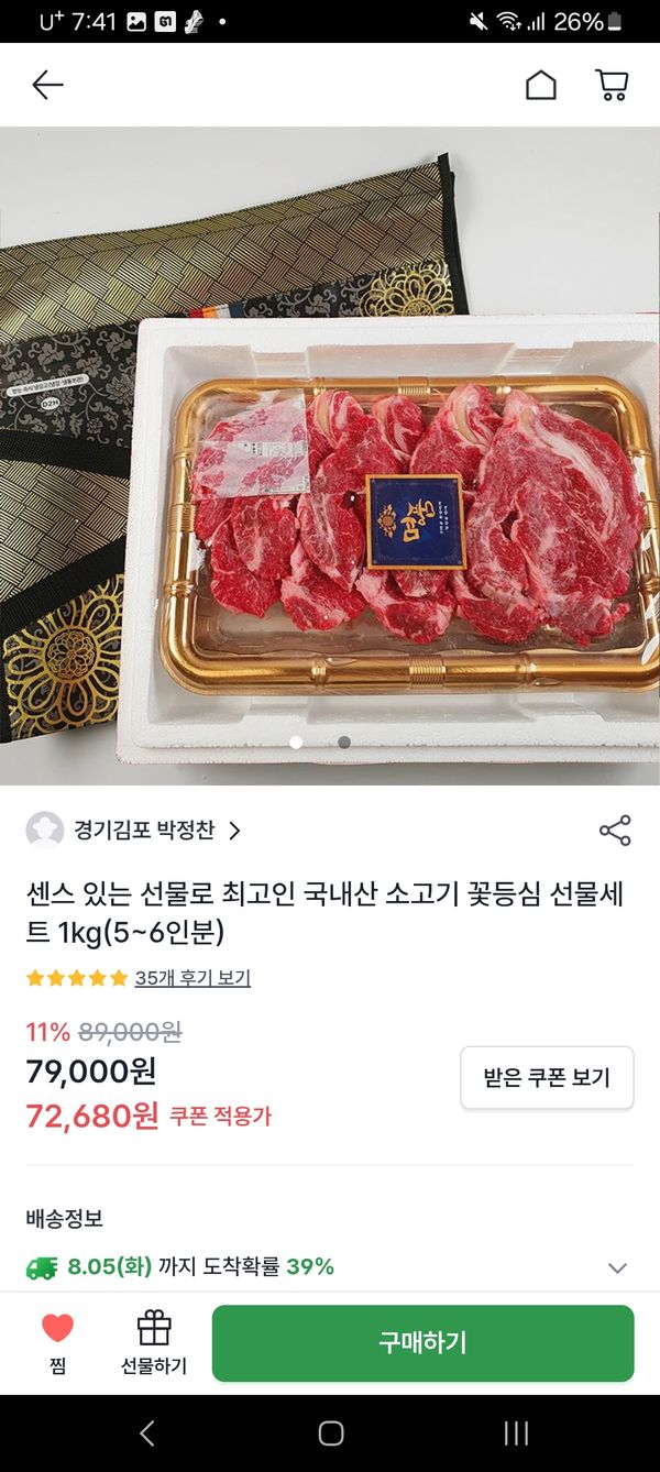 옵션: [즉시 수령] 국내산 소고기 꽃등심 선물세트 1kg(5~6인분)