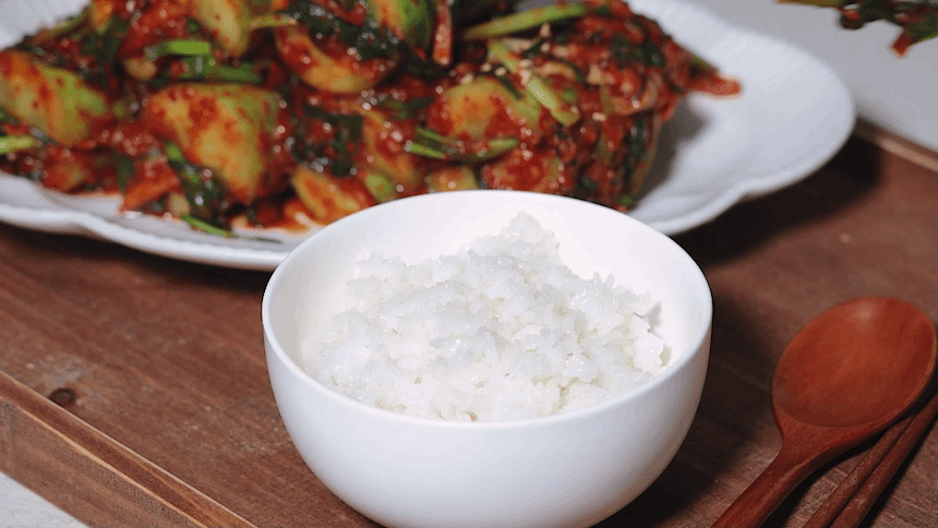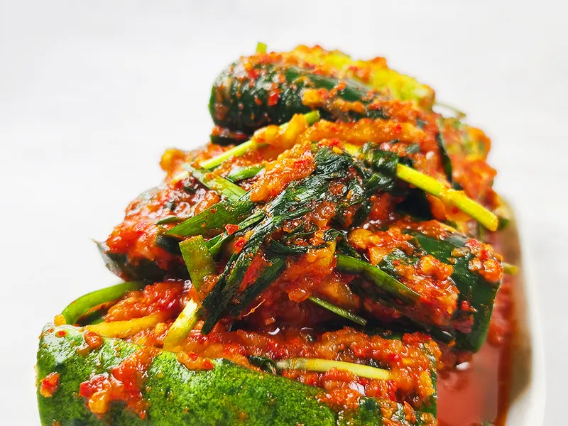 오이의 신선함을 그대로 담았습니다. 향긋한 부추와 수분감 많은 상큼한 오이를 맛깔나게 무쳐냈어요. 먹음직스러운 양념 색에 눈으로 한번, 아작아작 시원한 신선함에 입으로 다시 한번 놀라게 될 거예요.