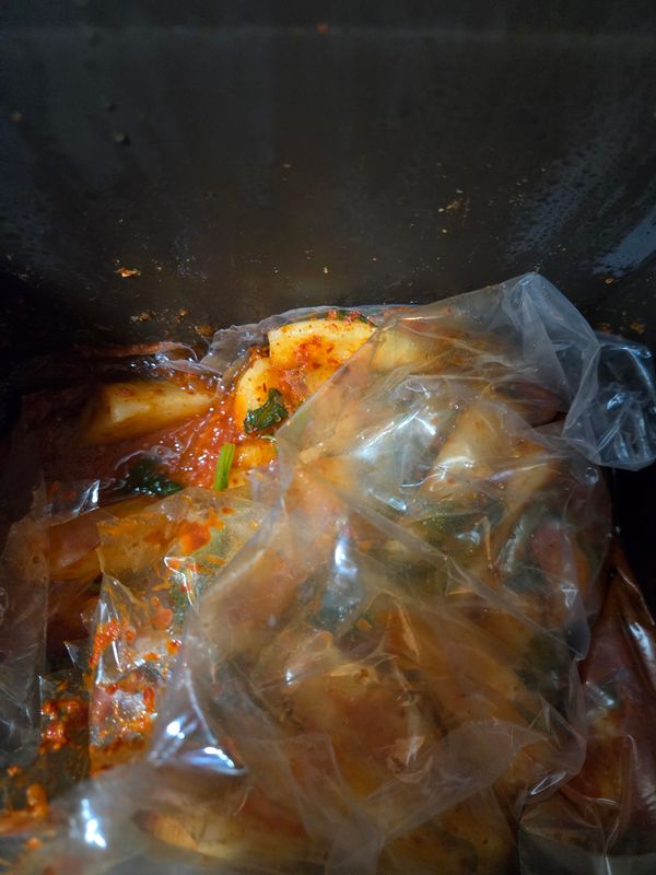 일단 바로 담은 총각 김치 입니다. 하루 쯤 숙성 해서 드시면 더 맛 있을듯요. 저희는 생김치부터 익은거 까지 다좋아 해서 바로 김치 냉장고 입니다. 추천 합니다~~