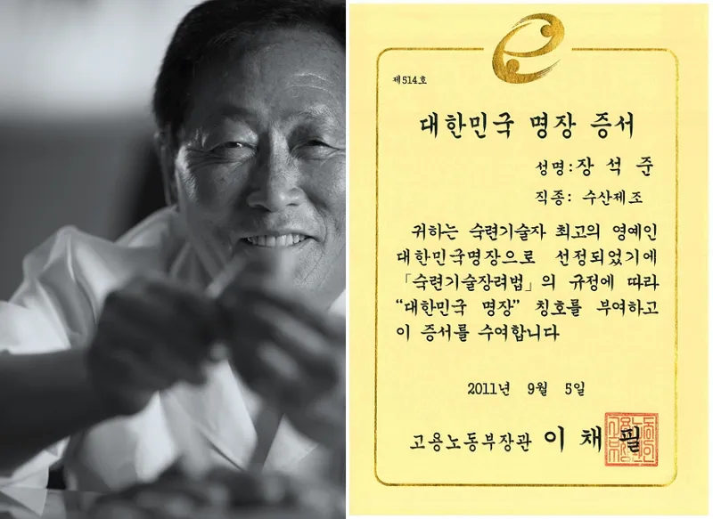2011년, 아버지인 故 장석준 회장은 명란 제조법의 1세대 전문가로 수산제조부분에서 최초이자 유일한 대한민국 명장으로 지정되셨습니다. 저 또한 아버지의 장인정신을 따라 저염명란 제조법, 조선명란 제조법으로 최초이자 유일한 대한민국 수산식품명인으로 지정됐습니다.