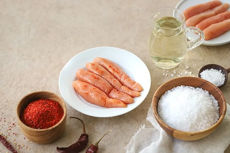 타르색소, 보존료를 사용하지 않는 것은 물론, 명란 업계 대부분이 사용하는 발색제도 일절 넣지 않습니다.
