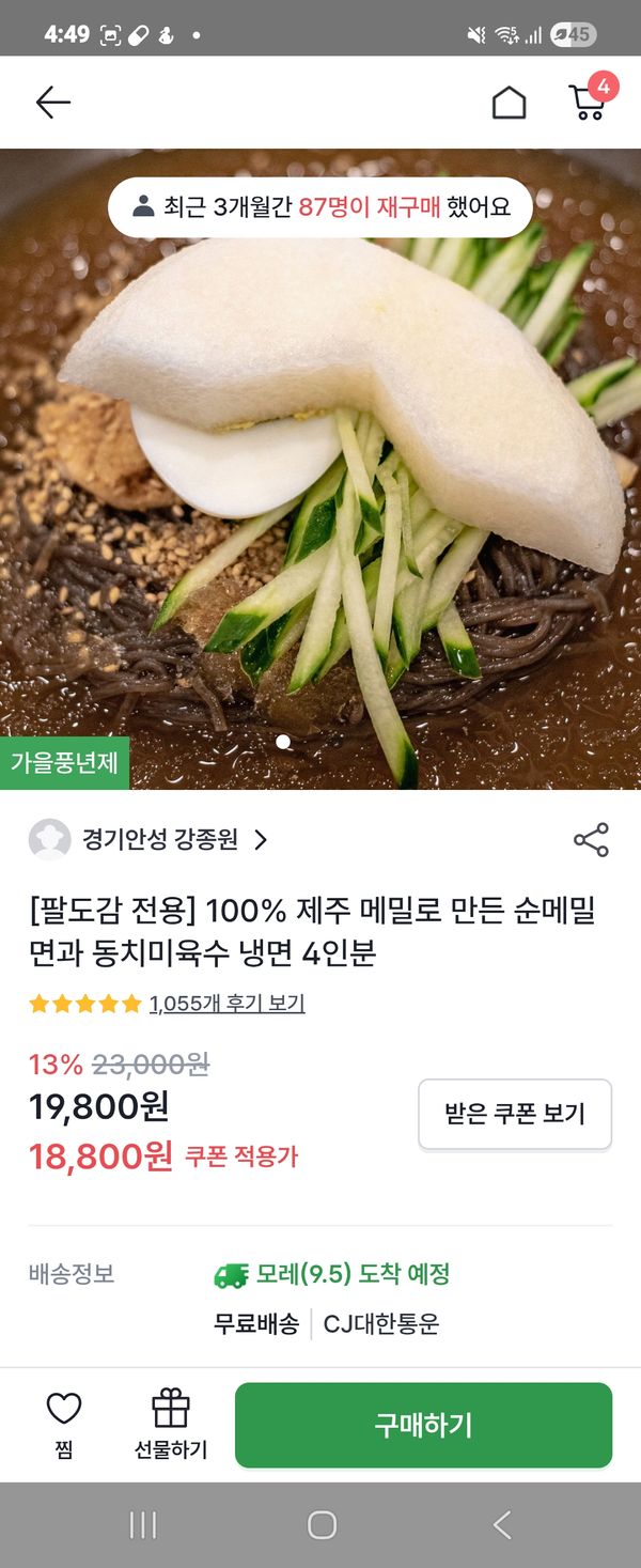 [팔도감 전용] 100% 제주 메밀로 만든 순메밀면과 동치미육수 냉면 4인분