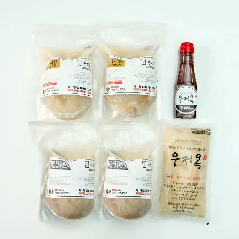 도가니탕 2팩, 특곰탕 2팩, 육수 600ml 1팩, 특제간장소스로 구성된 선물세트입니다.