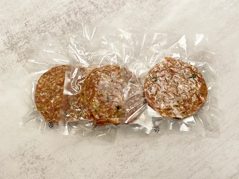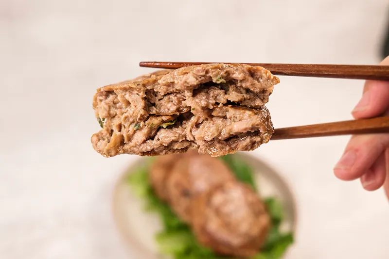 국산 원육을 갈지 않고, 썰어 만들어 식감이 살아 있어요.