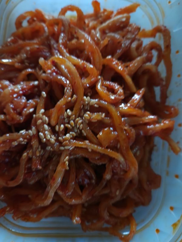 부드럽고 맛있습니다. 도시락반찬으로 나눠먹고 하루만에 이정도 남았어요. 진미채는 원래 비싸서 세일할때 쟁여 봐야겠습니다.