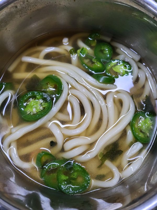배송되자마자 한개 끓여 호로록 먹었네요. 역시 우동은 쌀쌀한 날씨에 더 잘 어울리는거 같아요. 같이 배송시킨 할라피뇨를 넣었더니 칼칼한게 아주 맛있게 잘~먹었습니다.