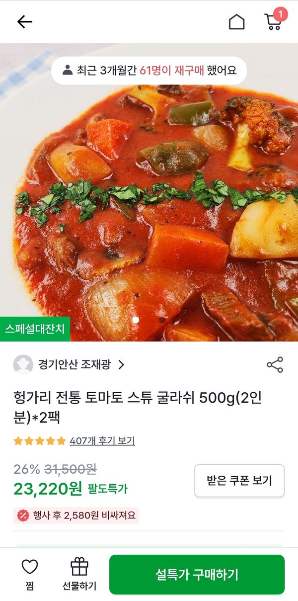 옵션: 굴라쉬 500g(2인분)*3팩