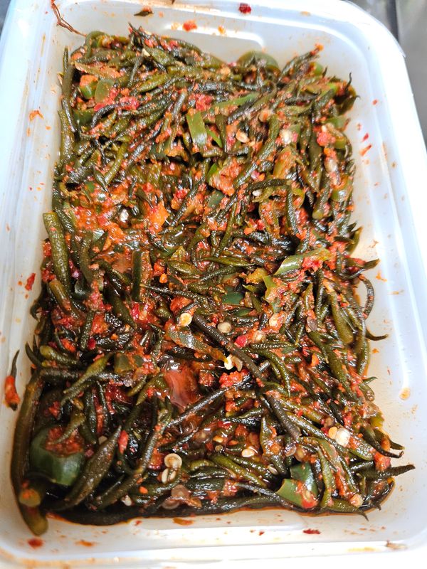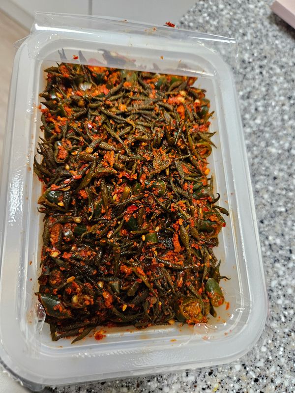 아주 매운 청양고추와 생 톳을 일일히 손질한 다음 감칠맛 나는 액젓으로 무쳤습니다.
