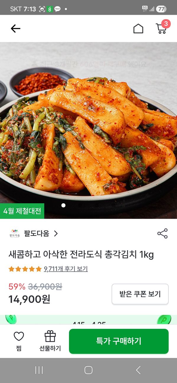가끔 주문하는 김치인데 여전히 많이 맵지않고 아삭아삭하고 시원한 맛으로 맛있는 총각김치예요 할인하여 또 주문했구요~ 배송도 빠르고 좋았어요 맛있게 먹을게요~감사해요~^^