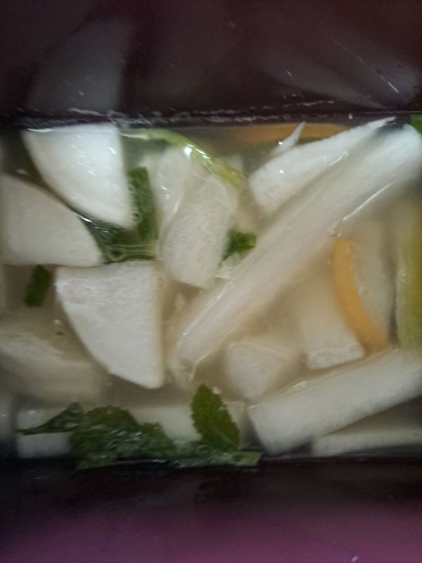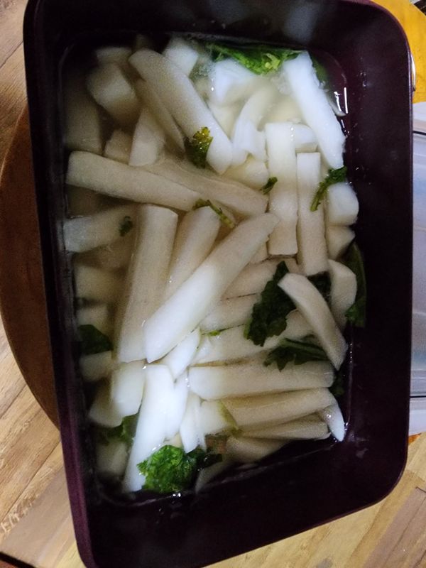 늘 재구매해서 먹는 동치미예요^^ 길게 썰어 놓은 상태라 먹기 편하고 국물이 좀 짠듯하면 생수 조금 부어서 드시면 좋아요^^