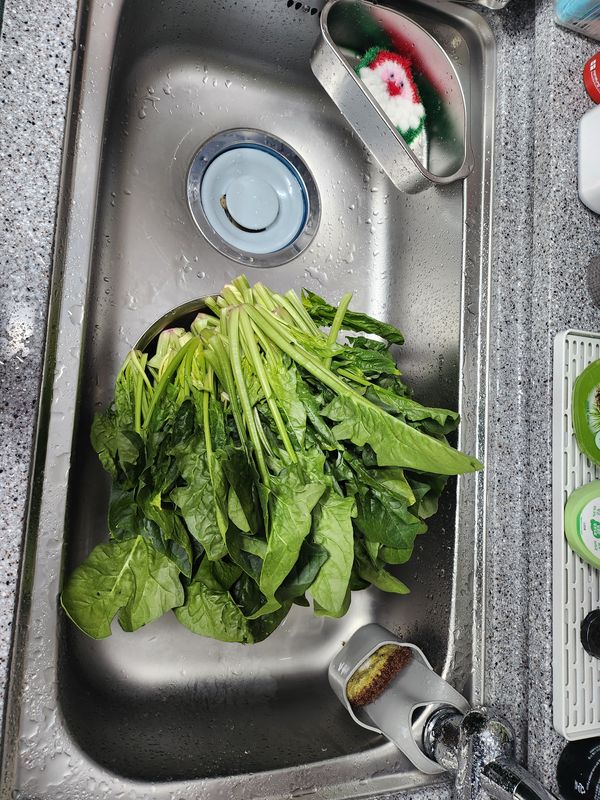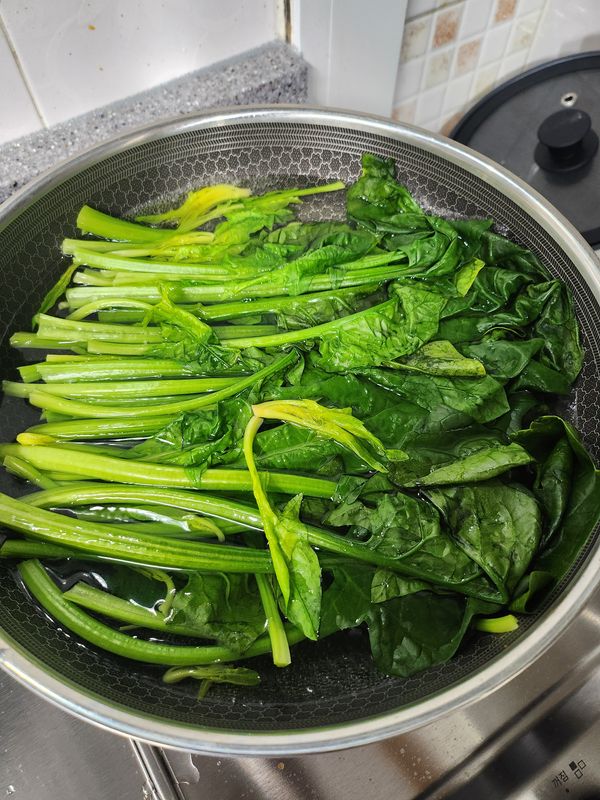 순간 상추인가 했어요 엄청 길고 줄기가 튼실해서 데치는데 시간차가 많이 나서 줄기와 잎은 잘라서 데칠껄 그랬어요 줄기시간에 맞춰 했더니 잎이 흐물해졌지만 시금치 맛은 있어요