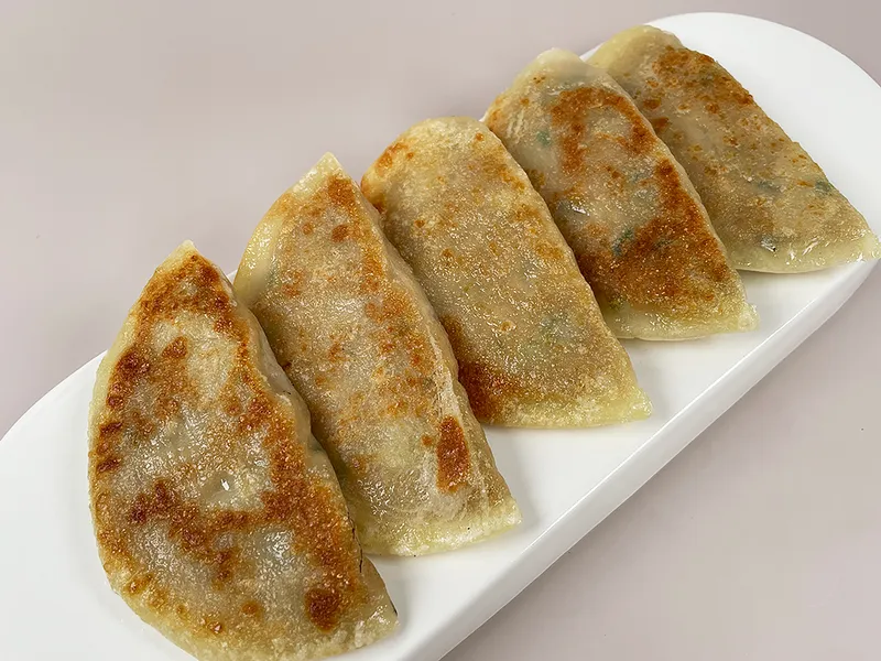 두툼하고 큼직한 크기를 자랑하는 납작왕군만두입니다. 얇고 쫄깃한 만두피에 속을 꽉 채워넣었습니다!