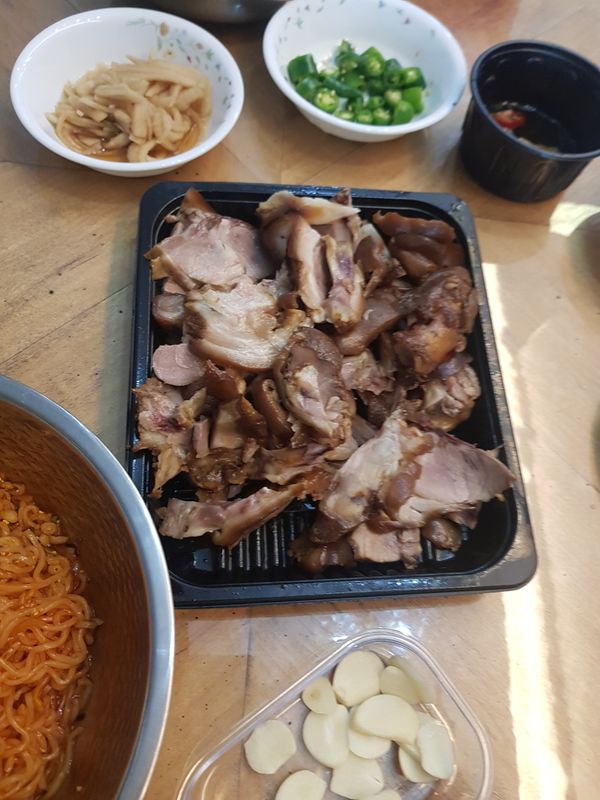 족발이 돼지고기 냄새가 하나도 안나고 쫄깃쫄깃하고 담백해서 맛있게 먹었습니다 그런데 무우장아찌는 별로 맛갈스럽지 않았어요