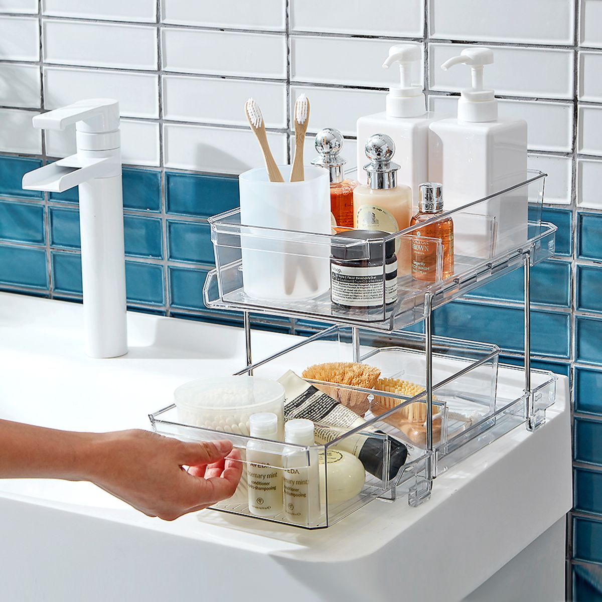 리메이크 투명 슬라이딩 2단 선반 X 2P세트 / 칸막이 수납 정리 양념통 영양제 트레이
