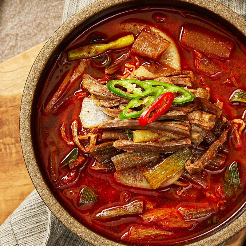결 따라 찢은 부드러운 소고기, 아삭한 숙주, 부드러운 무, 쫄깃한 토란 줄기까지! 건더기 하나하나가 잘 살아 있어 밥만 있으면 든든한 국물 한 상이 됩니다. 손이 많이 가는 육개장을 입에서 간편하게 즐기실 수 있어요.