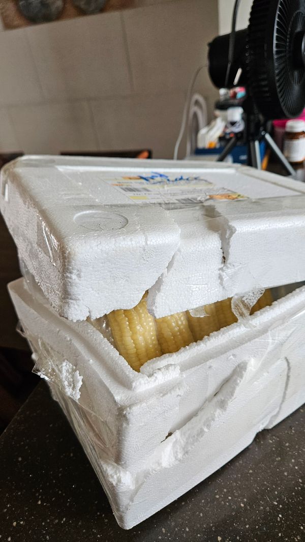 날이 너무덥긴했어요 아이스팩이 다녹고(1개) 옥수수도 냉동인데, 하나는 압축이풀어져다 녹긴했더라구요 물렁한상태로 옥수수 도착했어요 ㅠㅠ 그래도 오전 외출전에 받아봐서 바로 일단 냉동에 다시 넣긴했어요,,오후에 외출후 받았으면 못먹을뻔했네요..