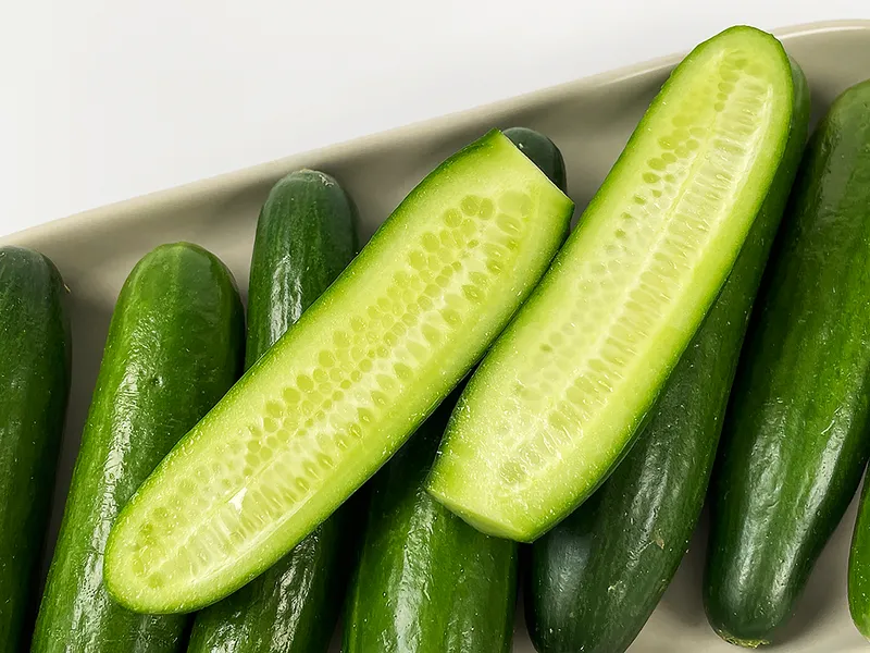 아삭아삭한 식감, 시원한 맛, 은은한 단맛을 자랑하 미니오이입니다. 수분 함량이 높고 칼로리가 낮은 편이라 입이 심심할 때 가볍게 먹기 좋습니다.