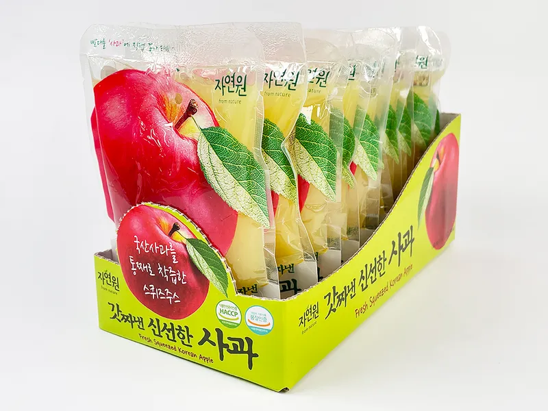 사과 주스 1포당 사과 1개를 통재로 착즙하여 만들었습니다. 신선한 사과즙을 손질없이 간편하게 섭취해 보세요!