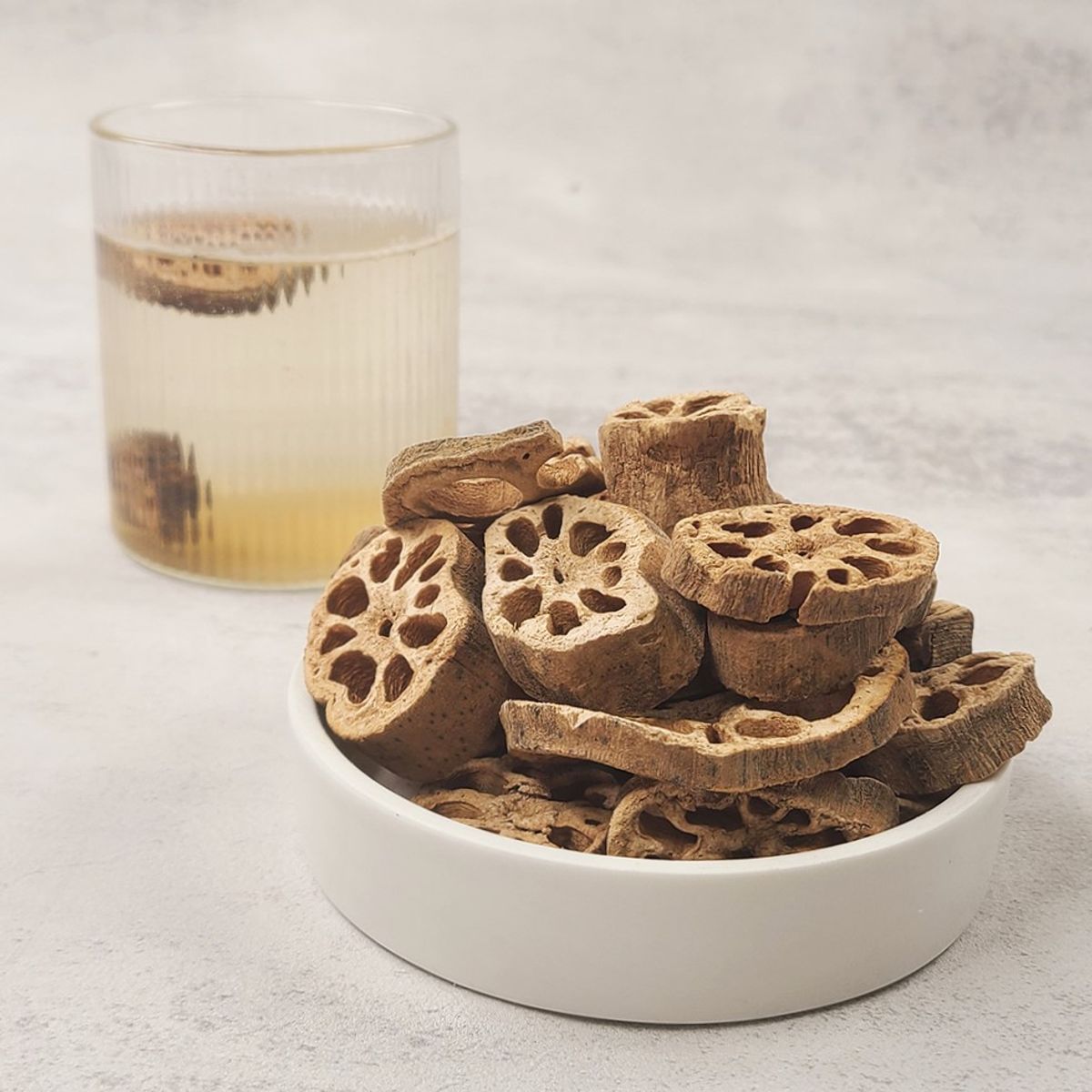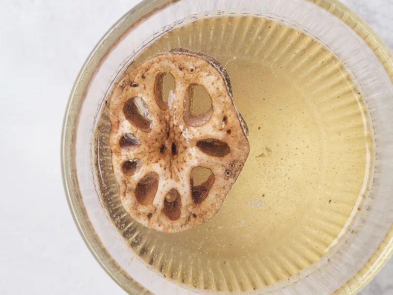 진한 연근의 향과 구수한 맛을 자랑하는 볶은 연근차입니다. 비옥한 땅에서 자란 연근을 사용했어요. 볶는 과정에서 생기는 연근 가루가 묻어있으니 흐르는 물에 살짝 세척 후 우려 드시기 바랍니다