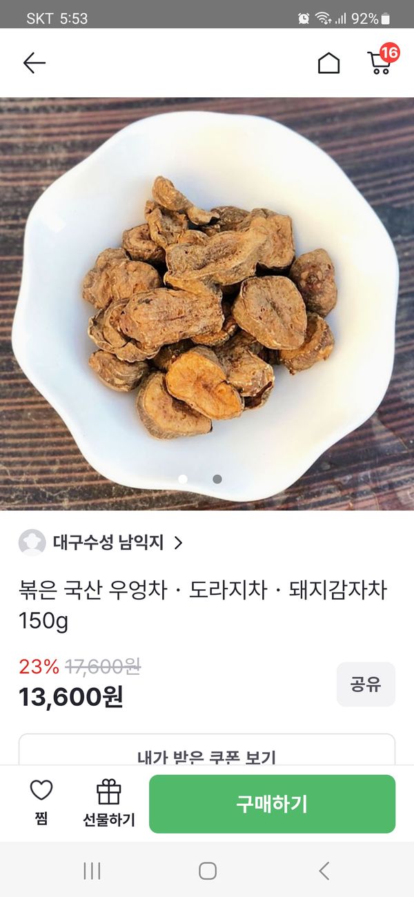 아침일찍 출근하는 남편이 따뜻하게 마실 차를 고마하던차에 선택한 돼지감자 차 맛도 구수하고 맛도 좋아요.
