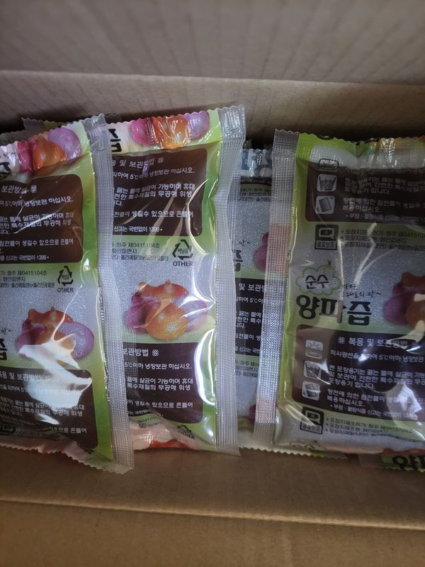 즙을 받다보면 1-2개 파손되기는 합니다 상자가 젖었네요 1개가 터진줄도 모르게 새어나왔습니다 50개가 한박스니 혹시나하고 1개쯤 여유로 넣어주셨더라면 하는 생각도 듭니다 제가 양파즙을 안먹어봐서 맛은 뭐라고 할순 없네요 남편오면 먹어보라고 해야겠어요